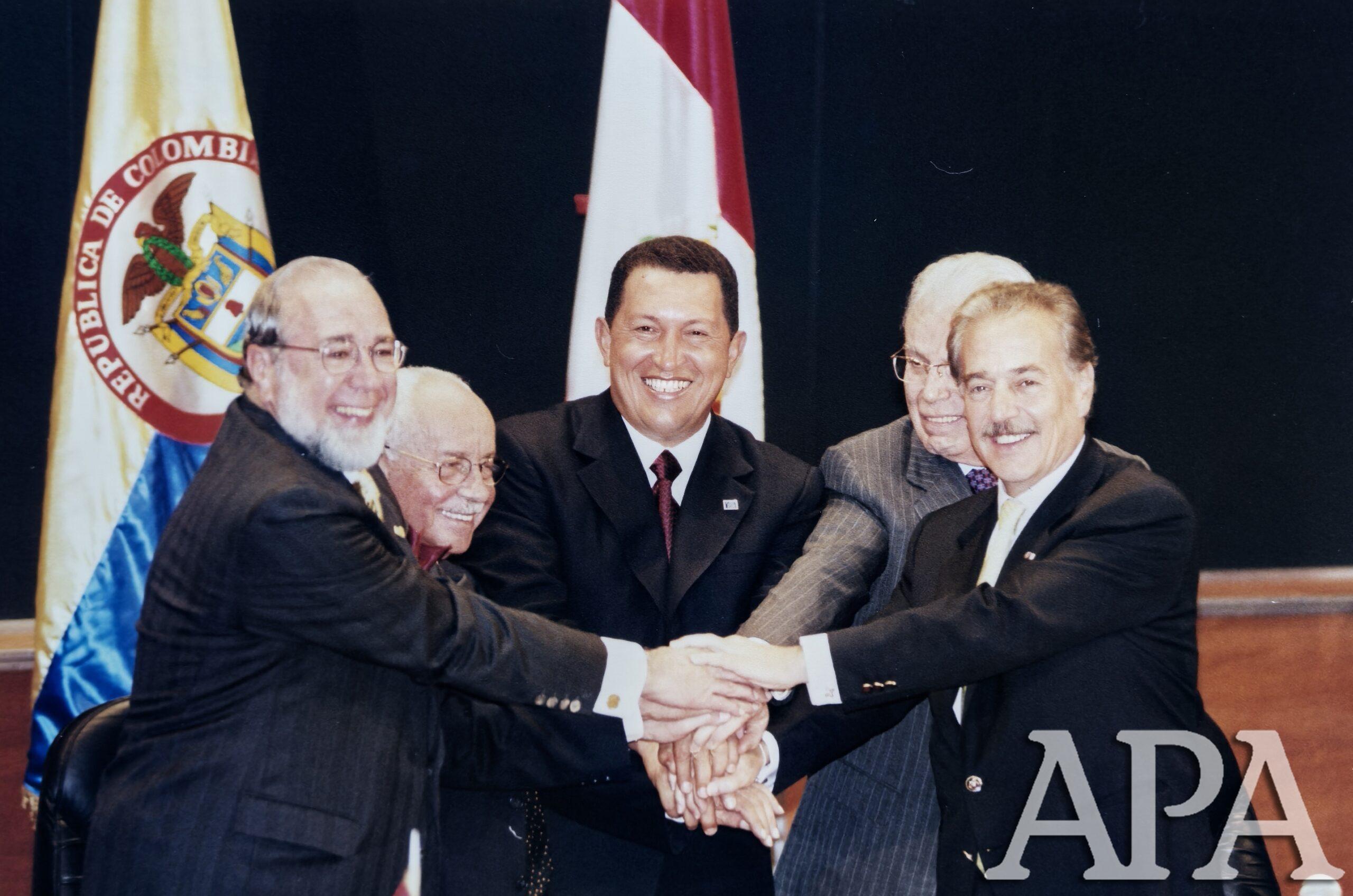 Con los Presidentes Hugo Chávez, Gustavo Noboa, Hugo Banzer y el Primer Ministro Javier Pérez de Cuéllar en la Clausura del XII Consejo Presidencial Andino. Valencia, Venezuela, Junio 23-2001